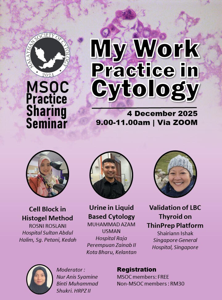 The Case Sharing Seminar is a yearly activity of MSOC since its first conception. This year session started with theme of thyroid cytology and organized through ZOOM. The session was organized on 20th March 2025, 9-11 am. It was attended by 90 participants consist of pathologist, trainee and cytotechnicians. The moderator for the session was Dr. Nur Dini Jalaludin from Hospital Kuala Lumpur and the speakers are Dr. Hasli Mohd Shafie (UPM), Dr. Nurfareha Hatta (UiTM), Dr Badrul Iskandar Abdul Wahab (UKM), Dr. Sugan Selvanathan (HKL) and Dr. Anila Govindsamy (Hospital Sultan Abdul Halim).