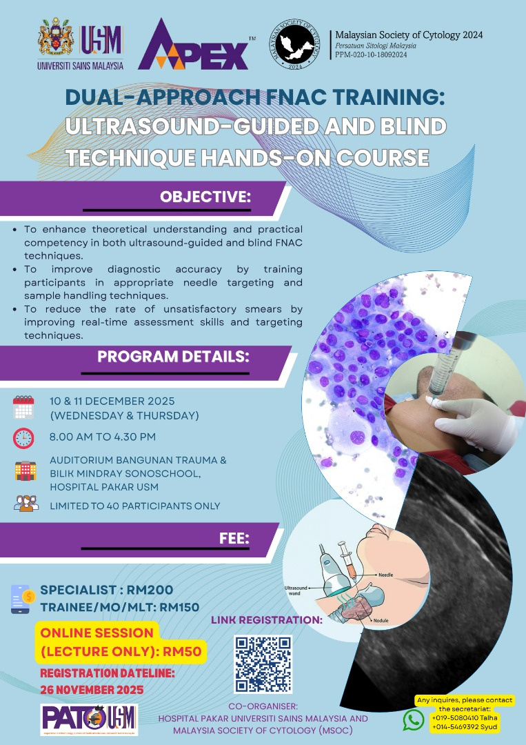 The Post Congress Seminar 2025 is organized by Department of Pathology, UiTM with collaboration of MSOC. The seminar was held in UiTM Sg. Buloh Campus on 3rd of October 2025. It was attended by more than 150 participants among include technicians, postgraduate masters students and pathologist. It was also held along with the 1st Annual General Meeting for MSOC 2024. The topics are on Liquid Based Cytology, given by 2 international speakers; Prof. Dr. Mark C. Chien from Taiwan and Dr. Sangeeta Mantoo from Singapore.